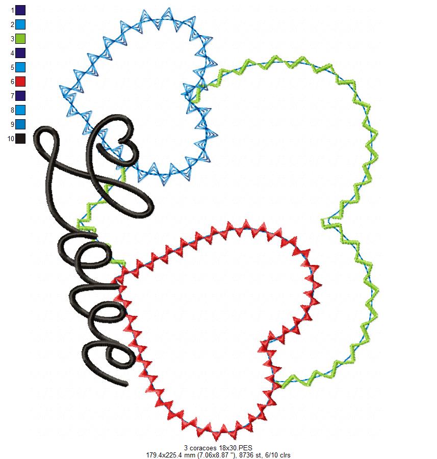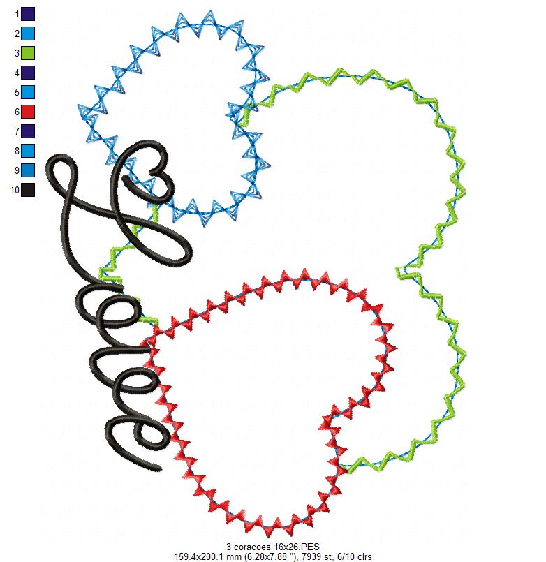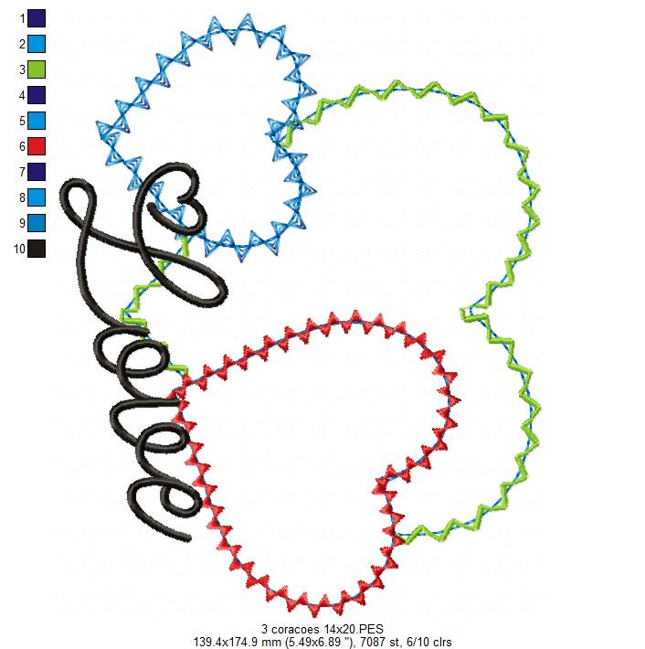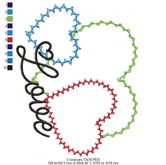 Matriz de Bordado 3 Corações com Love – Aplique Zig Zag Romântico