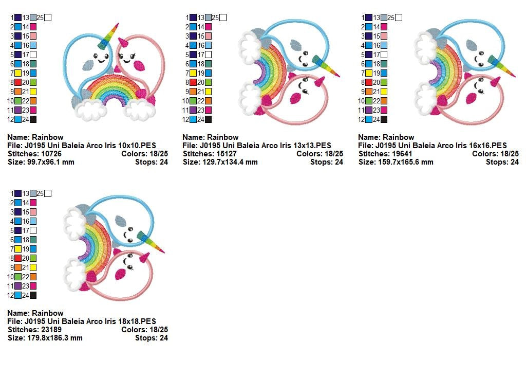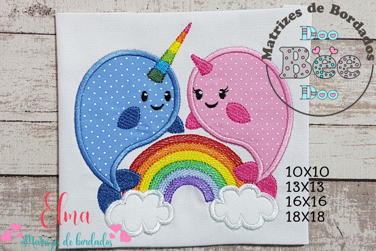 Matriz de Bordado Baleias Unicórnio com Nuvens e Arco-Íris – Aplique