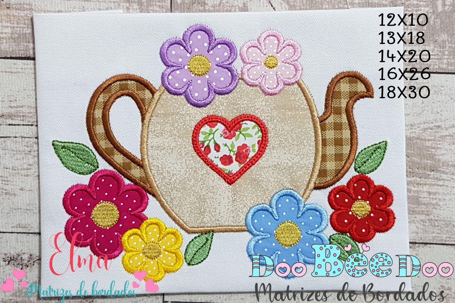Matriz de Bordado Chaleira Decorada com Flores – Aplique