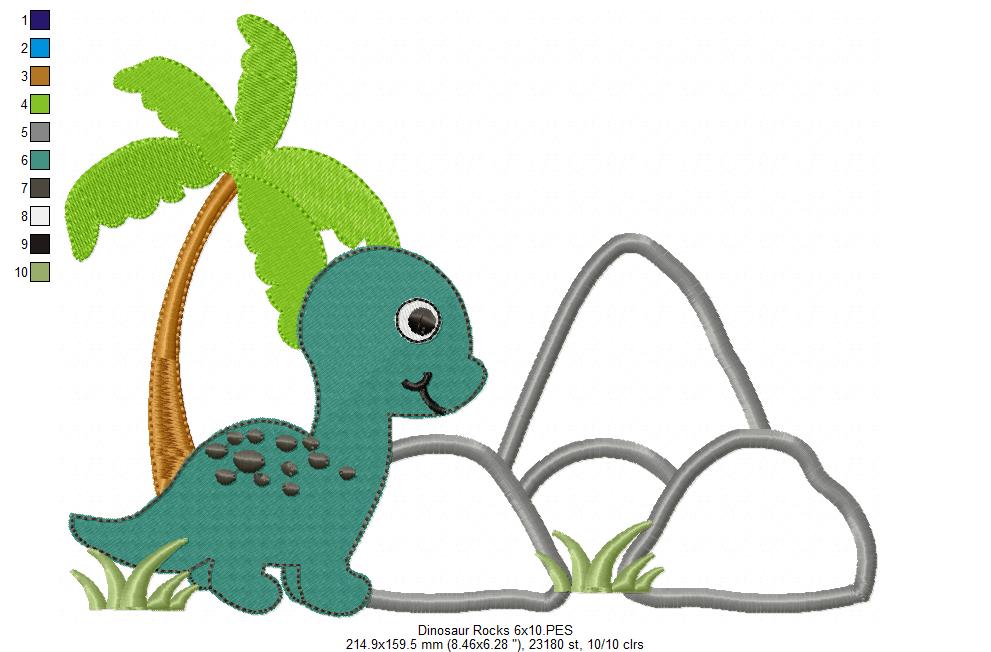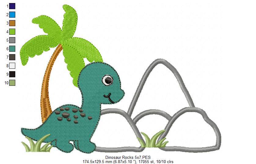 Matriz de Bordado Dinossauro com Palmeira e Rochas – Aplique