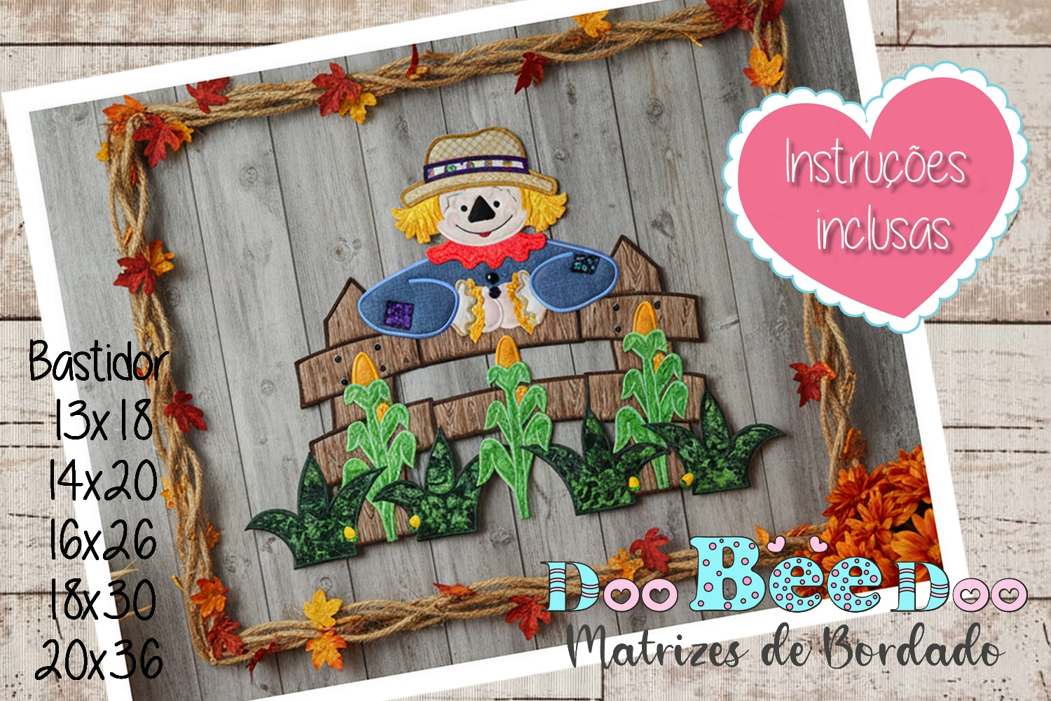 Dê um toque de charme outonal à sua casa com este Projeto ITH de Espantalho com Milhos. Perfeito para enfeitar portas, paredes ou compor sua coleção de bordados de outono, este design une aconchego e criatividade. O simpático espantalho apoiado na cerca com detalhes de milhos vai alegrar sua decoração da estação.