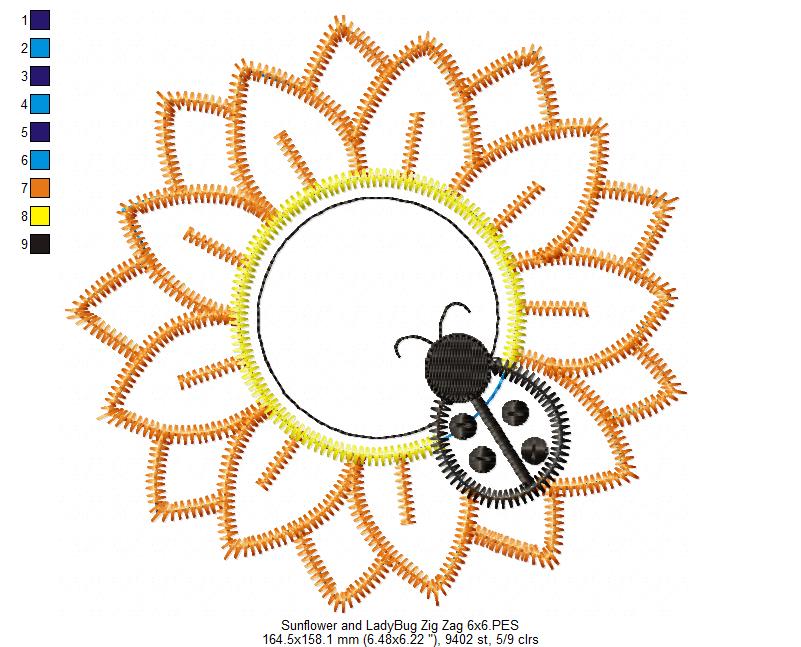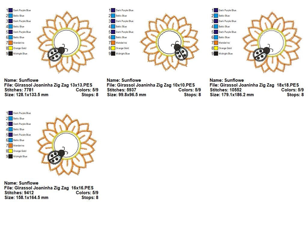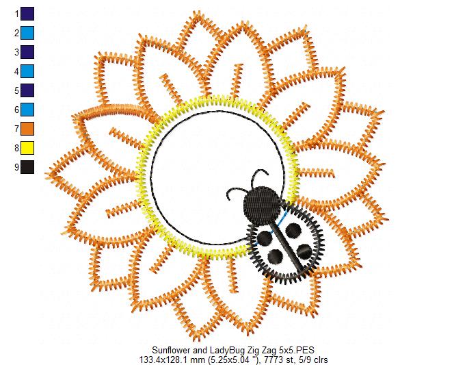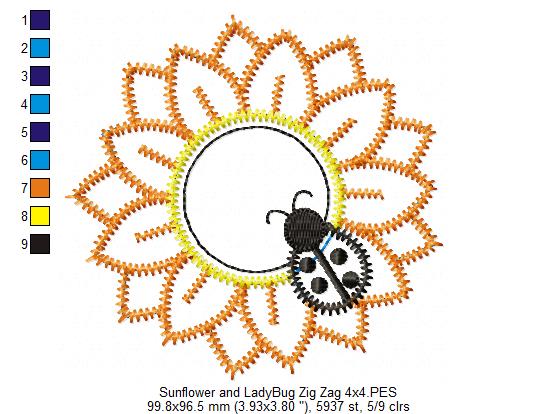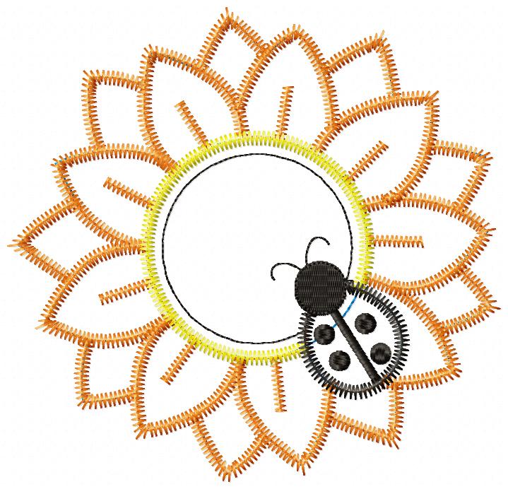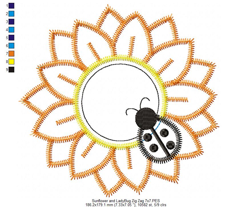 Matriz de Bordado Girassol com Joaninha Charmosa – Aplique Zig Zag