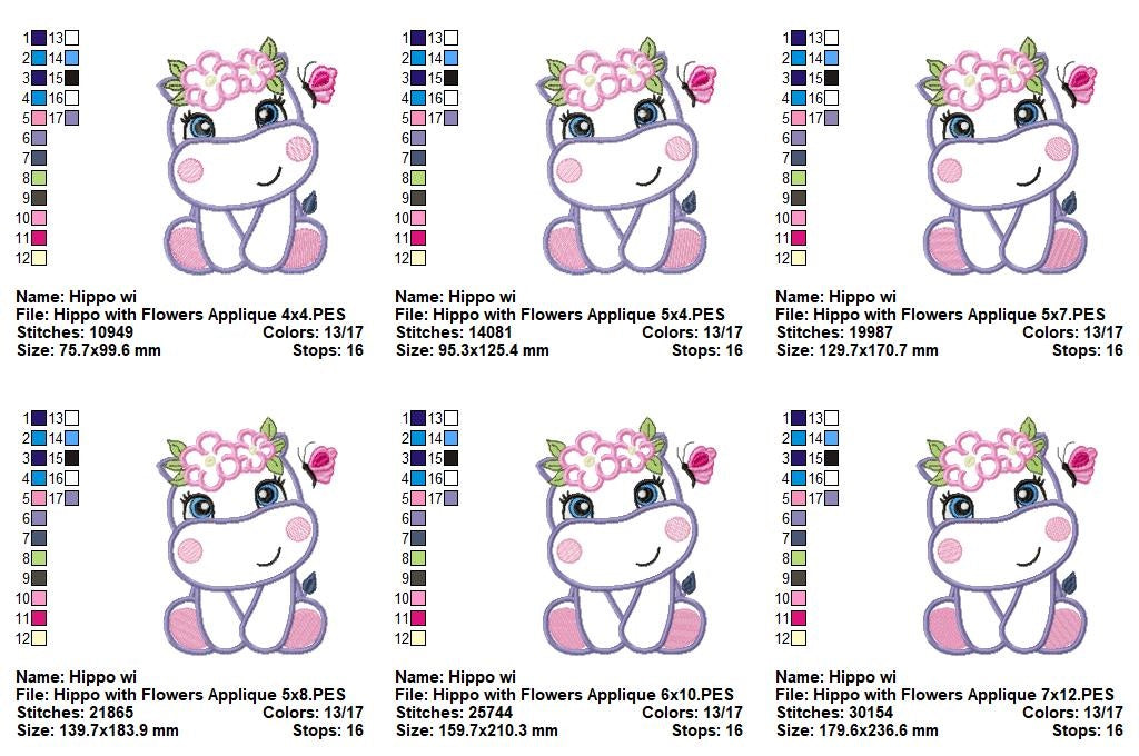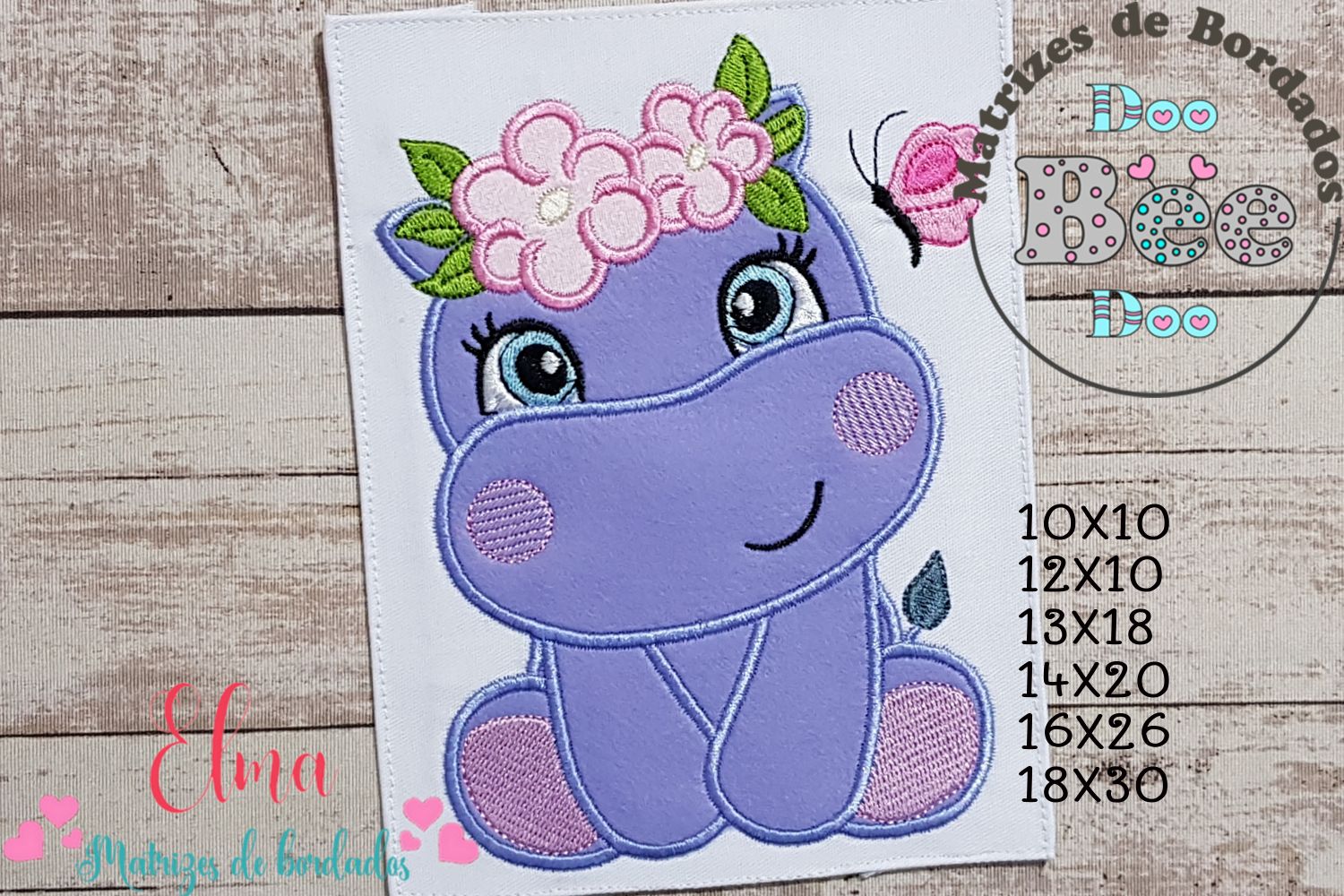 Encante seus bordados com esta fofa matriz de hipopótamo em aplique, com um toque delicado de flores e uma borboletinha charmosa! 💕