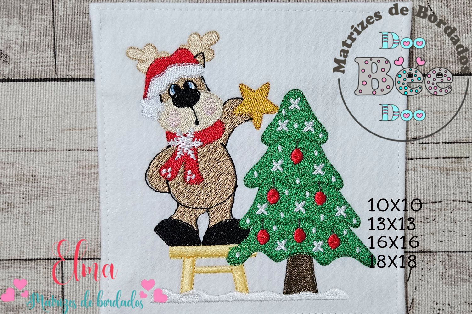 Com uma rena fofinha decorando a árvore de Natal com uma estrela brilhante, esse bordado é perfeito para personalizar toalhas, panos de prato, mantas, camisetas e até itens de decoração natalina 🎁