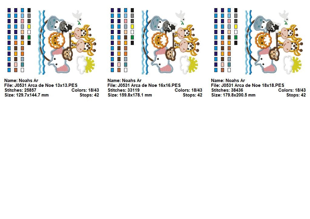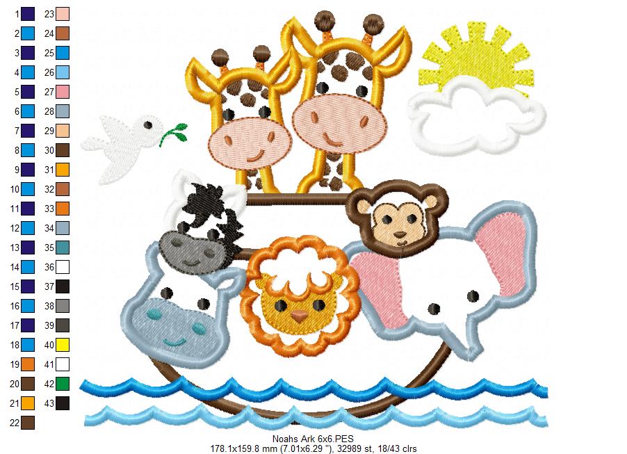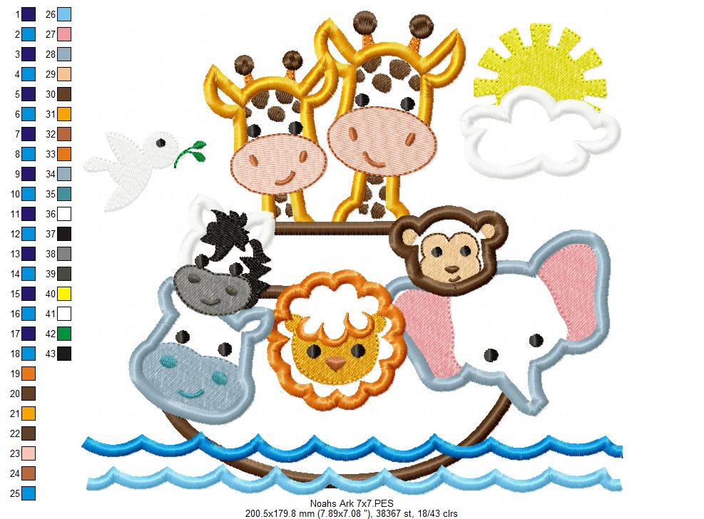 Transforme suas criações infantis com esta linda matriz de bordado da Arca de Noé super divertida! 🛶🌈 Com personagens encantadores como girafas, leãozinho, macaquinho, elefante, zebra, hipopótamo, pombinha e até o sol com nuvem ☁️🌞, essa matriz vai dar um toque especial em toalhas, mantas, almofadas, roupas infantis e muito mais! 🎁✨