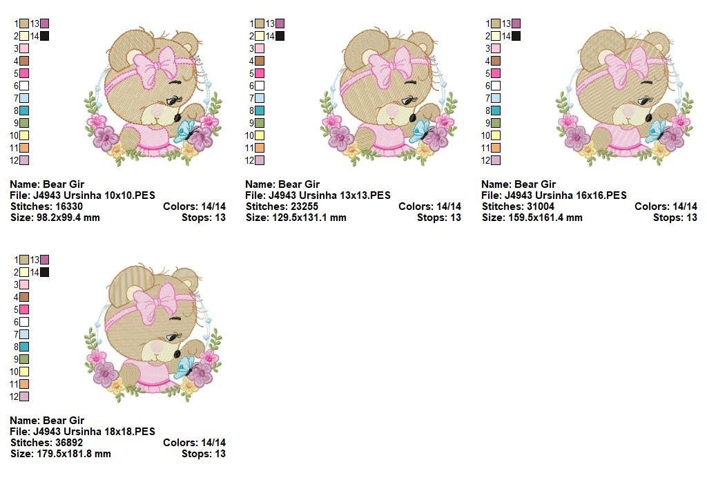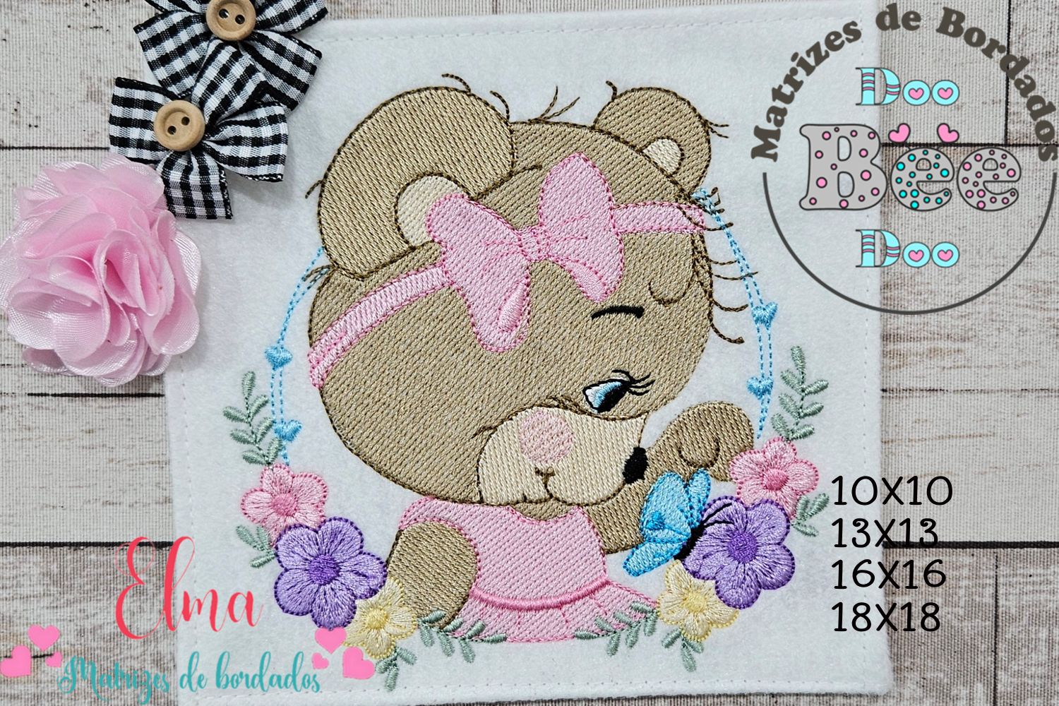 A charmosa ursinha com seu lacinho rosa e a linda borboleta azul criam uma cena cheia de amor e suavidade, perfeita para bordar em peças infantis, enxovais, toalhas, fraldas, almofadas e lembrancinhas. 🌸🦋